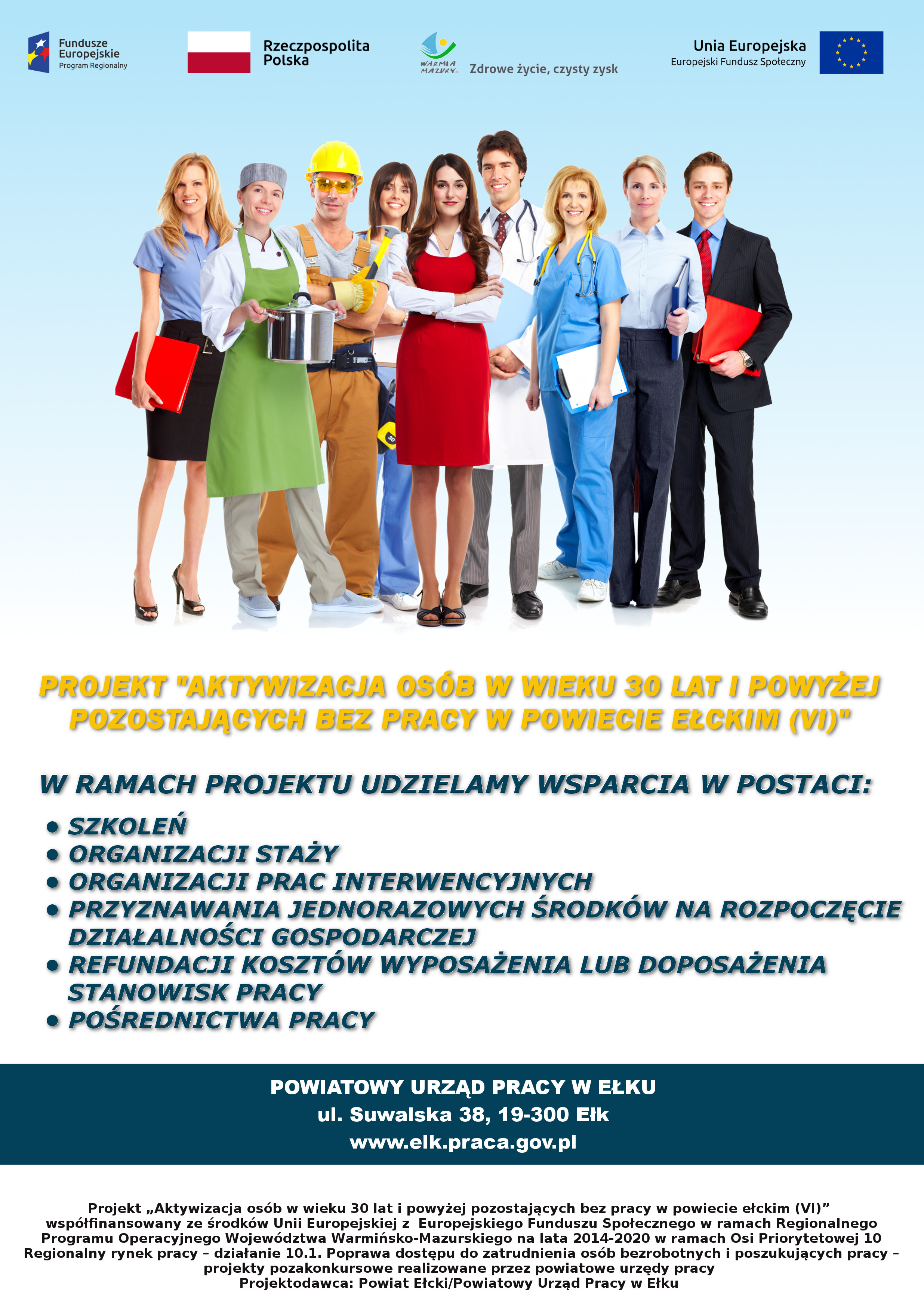 Celem głównym projektu jest zwiększenie zdolności do zatrudnienia osób od 30 roku życia pozostających bez pracy w powiecie ełckim.