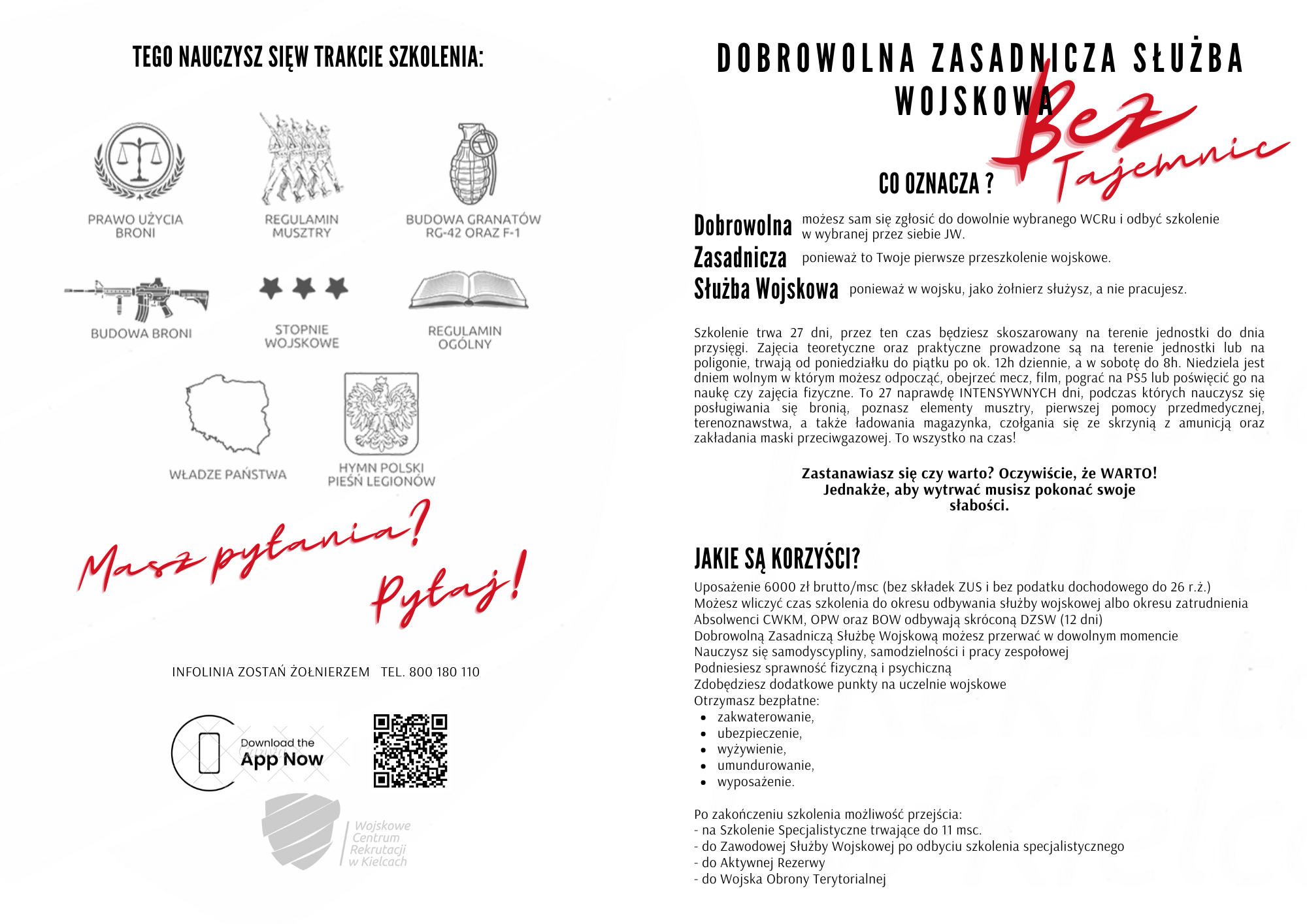 Wojsko Polskie umożliwia pełnienie zaszczytnej służby Ojczyźnie, która daje szansę rozwoju zawodowego oraz sprawdzenia się. Ministerstwo Obrony Narodowej realizuje cyklicznie szereg programów szkoleniowych i edukacyjnych mających na celu zwiększenie zainteresowania służbą wojskową. To programy, które dają szanse przeszkolenia różnym grupom wiekowym obywateli. Celem powyższych szkoleń oraz projektów edukacyjnych MON jest budowa odporności obywateli i całego Państwa na możliwe zagrożenia, wzmocnienie bezpieczeństwa Polski i jej mieszkańców. To odpowiedź na rosnące wyzwania dotyczące bezpieczeństwa i potrzeby budowania odporności państwa.
